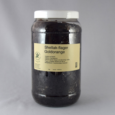 Denne shellak er guld orange. Shellak fås i flere nuancer, som er afhængige af både træerne de kommer fra og hvordan shellakken renses.